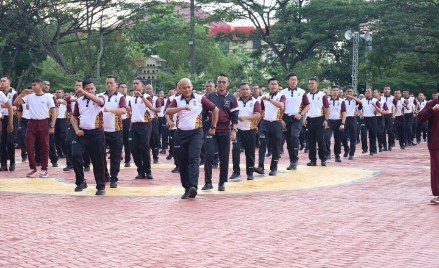 Olahraga bersama berupa senam yang dipandu instruktur dari luar yang digelar seusai apel pagi di Lapangan Mapolda Aceh.