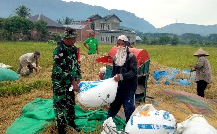 Dengan penuh semangat, Sertu Sarwani menyingsingkan lengan bajunya dan terjun langsung ke lokasi panen bersama para petani. Di tengah terik matahari, ia tak segan ikut merontokkan bulir-bulir padi dari batangnya, sebuah pekerjaan yang membutuhkan ketelatenan dan tenaga ekstra. Kehadirannya di tengah sawah bukan hanya sekadar membantu, tetapi juga menjadi bentuk nyata kepedulian TNI terhadap kesejahteraan masyarakat, khususnya para petani.