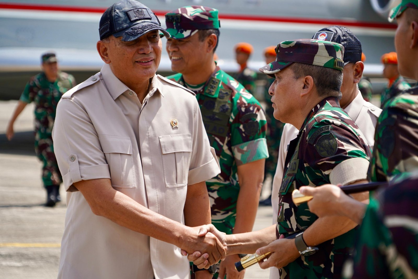 Aceh Besar — Panglima Komando Daerah Militer Iskandar Muda (Pangdam IM), Mayor Jenderal TNI Niko Fahrizal, M.Tr. (Han), bersama Kepala Staf Kodam (Kasdam) IM, Brigadir Jenderal TNI Ayi Supriatna, S.I.P., M.M., serta para Pejabat Utama Kodam IM, menyambut langsung kedatangan Menteri Pertahanan Republik Indonesia (Menhan RI), Letnan Jenderal TNI (Purn.) Sjafrie Sjamsoeddin, di Pangkalan Udara Sultan Iskandar Muda (Lanud SIM), Blang Bintang, Kabupaten Aceh Besar, pada Selasa (24/6/2025).