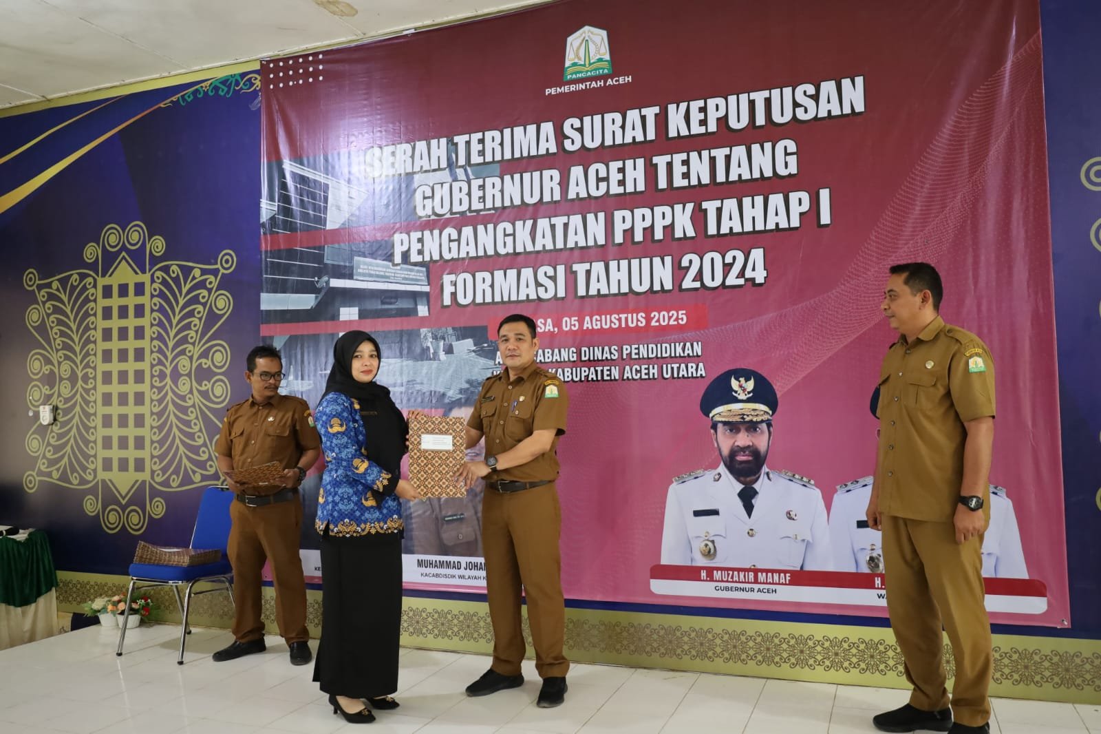 Sementara Kepala Cabang Dinas Pendidikan Aceh Utara, Muhammad Johan, S.Pd.,M.Pd menyerahkan SK di Aula Cabang Dinas Pendidikan setempat kepada 58 P3K. Dari 58 pegawai tersebut, 15 diantaranya, penempatannya di Kantor Cabang Dinas Pendidikan Aceh Utara. Selebihnya, tersebar di SMA/SMK/SLB di Aceh Utara. Usai penyerahan SK, dilanjutkan dengan sesi foto bersama.