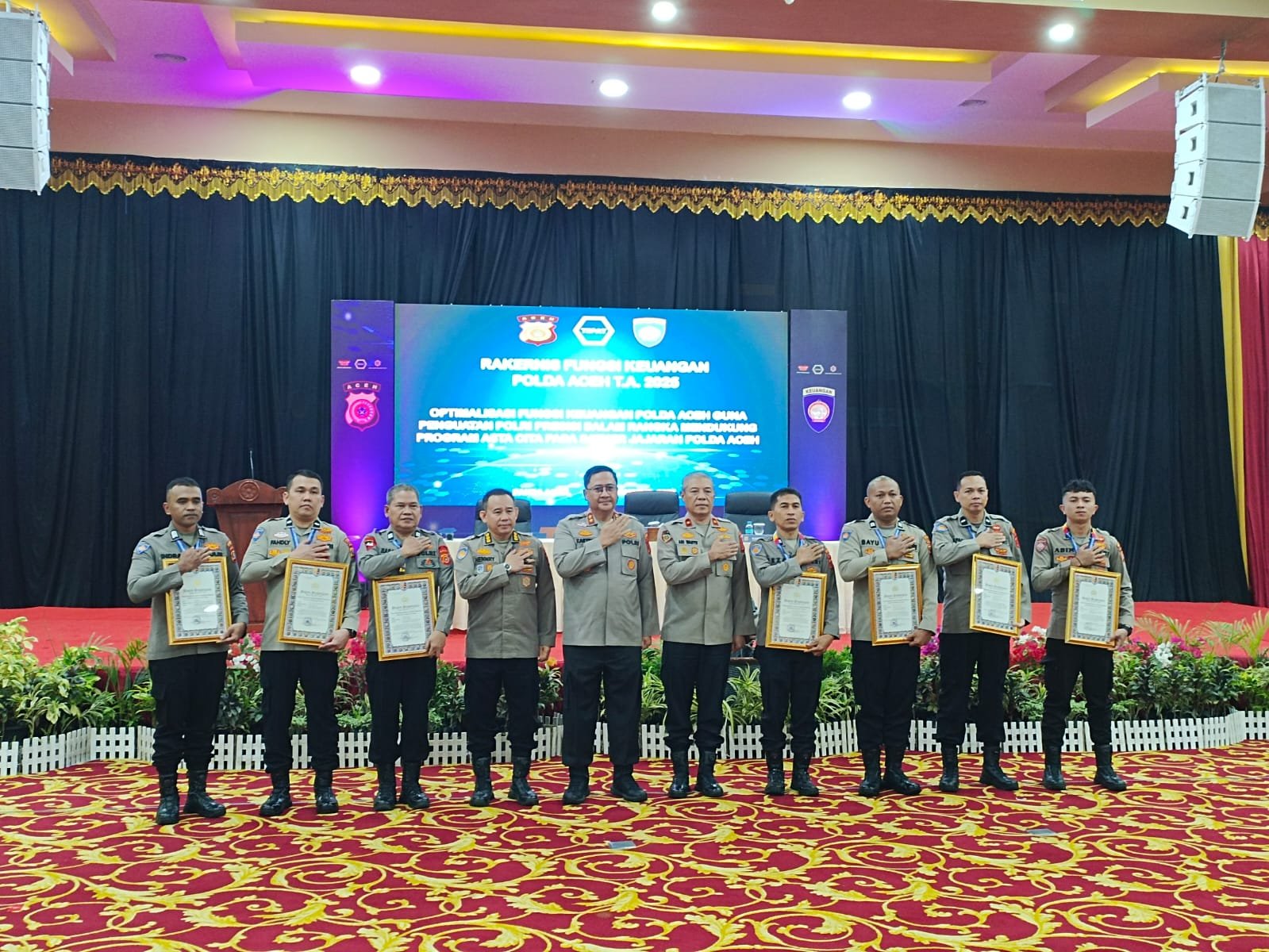 Polres Aceh Tamiang menerima penghargaan Kapolri bagi Bendahara berprestasi T.A 2024 yang diserahkan langsung oleh Kapolda Aceh Irjen Pol. Achmad Kartiko, S.I.K, M.H dalam kegiatan Rakernis Fungsi Keuangan Polda Aceh T.A. 2025 bertempat di Aula Hotel Amel, Banda Aceh. Kamis 7 Agustus 2025.