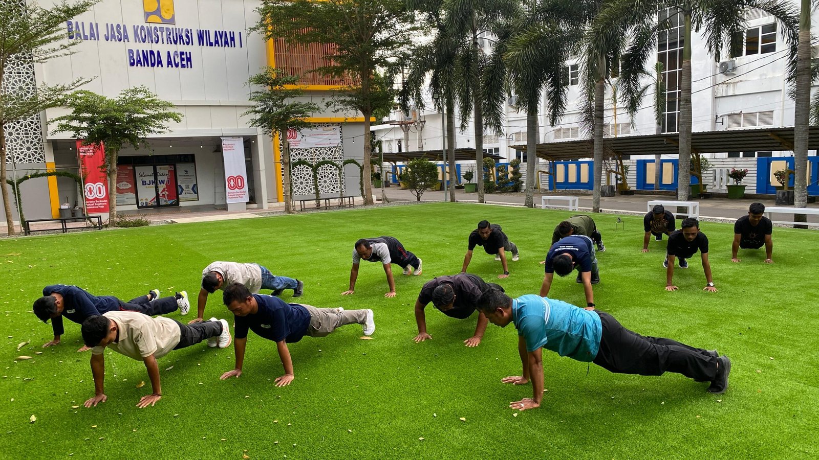 Banda Aceh – Suasana semangat dan penuh disiplin tampak di Balai Jasa Konstruksi Wilayah I Banda Aceh saat para peserta pelatihan dan uji sertifikasi kompetensi tenaga kerja kontruksi operator alat berat mengikuti pembinaan fisik dan mental, Minggu (31/09/2025).
