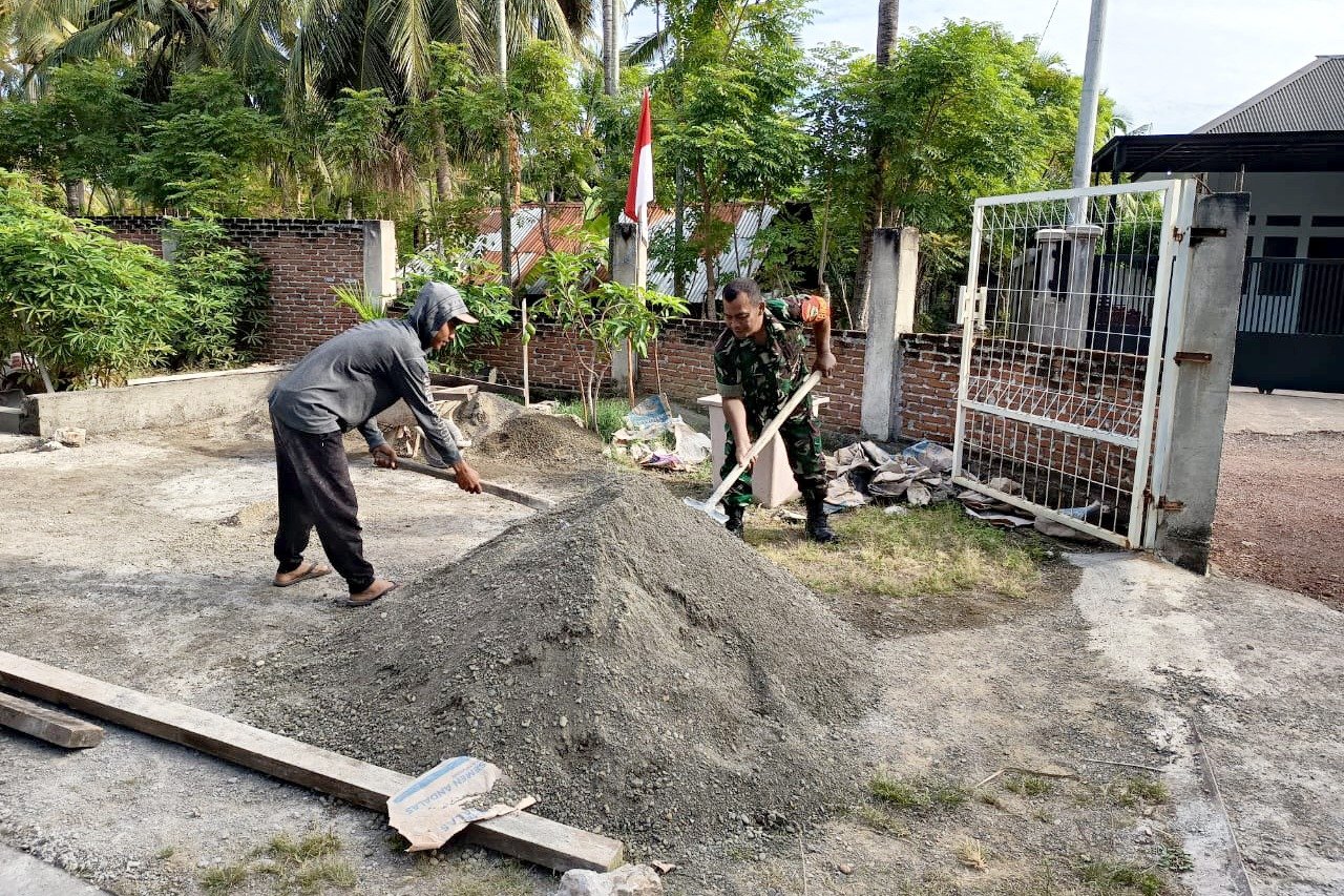 Dengan tangan berlumur semen, Serka Aswad tanpa ragu ikut mengaduk adonan untuk mempercepat proses pembangunan. Suasana gotong royong terasa hangat ketika TNI dan masyarakat bahu-membahu menyelesaikan pekerjaan. Kehadiran Babinsa ini bukan hanya mempercepat pekerjaan, tetapi juga memberikan semangat baru bagi warga yang sedang merenovasi rumahnya.