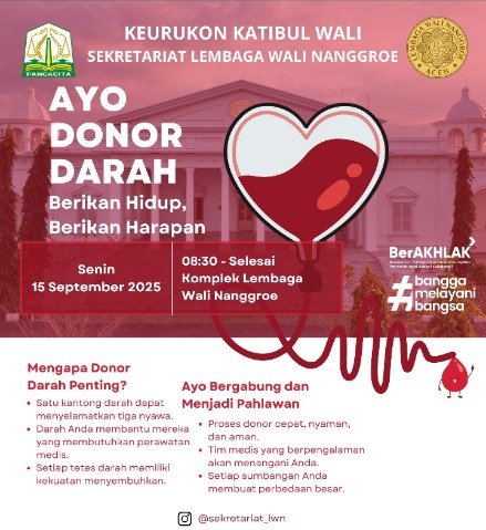 BANDA ACEH – Sekretariat Lembaga Wali Nanggroe melalui Keurukon Katibul Wali menggelar kegiatan donor darah dengan tema “Berikan Hidup, Berikan Harapan”, pada Senin, 15 September 2025.