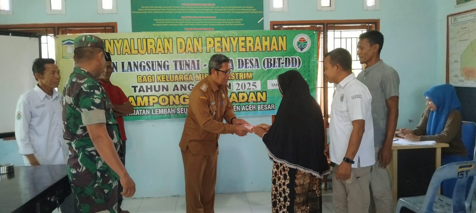 Dalam kegiatan ini, Babinsa Koramil 24/Lembah Seulawah Kodim 0101/Kota Banda Aceh, Sertu Edi Asril, turut hadir mendampingi perangkat desa. Kehadiran Babinsa bukan hanya sebagai pengawas, tetapi juga untuk memastikan penyaluran bantuan berjalan lancar, tertib, dan tepat sasaran.