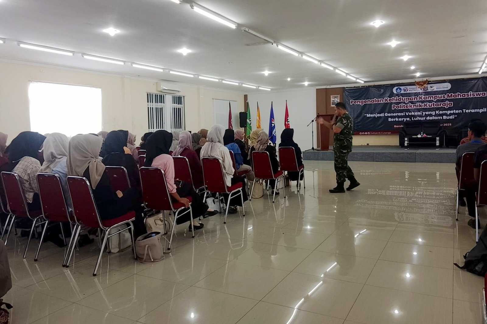 Banda Aceh – Bati Tuud Koramil 13/Kuta Alam, Kodim 0101/Kota Banda Aceh, Pelda Suheri Wisesa memberikan materi Wawasan Kebangsaan (Wasbang) kepada mahasiswa baru Politeknik Kuta Raja Banda Aceh dalam rangka kegiatan Pengenalan Kehidupan Kampus bagi Mahasiswa Baru (PKKMB) Tahun 2025, yang berlangsung di Kampus Politeknik Kuta Raja, Jalan Syiah Kuala, Gampong Bandar Baru, Kecamatan Kuta Alam, Kota Banda Aceh, Selasa (23/9/2025).