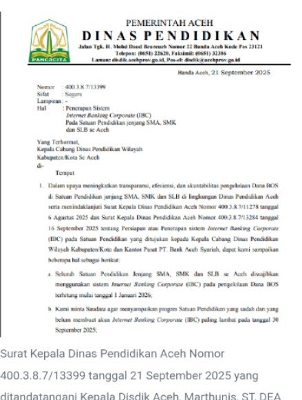 Kebijakan tersebut disampaikan melalui Surat Kepala Dinas Pendidikan Aceh Nomor 400.3.8.7/13399 tanggal 21 September 2025 yang ditandatangani Kepala Disdik Aceh, Marthunis, ST, DEA.