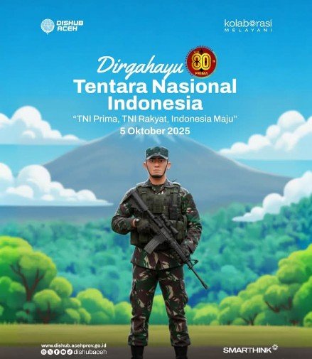 BANDA ACEH – Dinas Perhubungan Aceh menyampaikan ucapan selamat memperingati Hari Ulang Tahun (HUT) ke-80 Tentara Nasional Indonesia (TNI) yang jatuh pada tanggal 5 Oktober 2025. Peringatan ini menjadi momentum penting untuk mengenang jasa besar TNI dalam menjaga keutuhan dan kedaulatan Negara Kesatuan Republik Indonesia (NKRI).