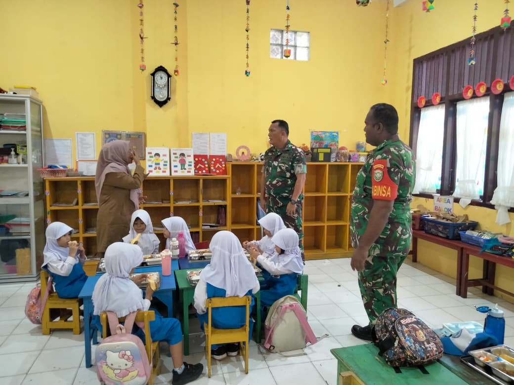 Kehadiran personel TNI tidak hanya memastikan kelancaran kegiatan, tetapi juga memberi semangat kepada para siswa dan guru. Suasana penuh keceriaan terlihat saat anak-anak menerima makanan bergizi yang dibagikan.