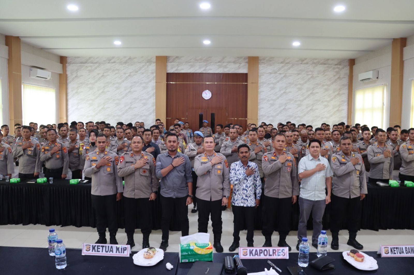 “Personel di lapangan harus siap melakukan langkah persuasif maupun tindakan tegas terhadap pihak-pihak yang berupaya mengganggu kelancaran tahapan pemungutan dan penghitungan suara,” tegas Kapolres melalui Kasi Humas AKP Mahruzar Hariadi.