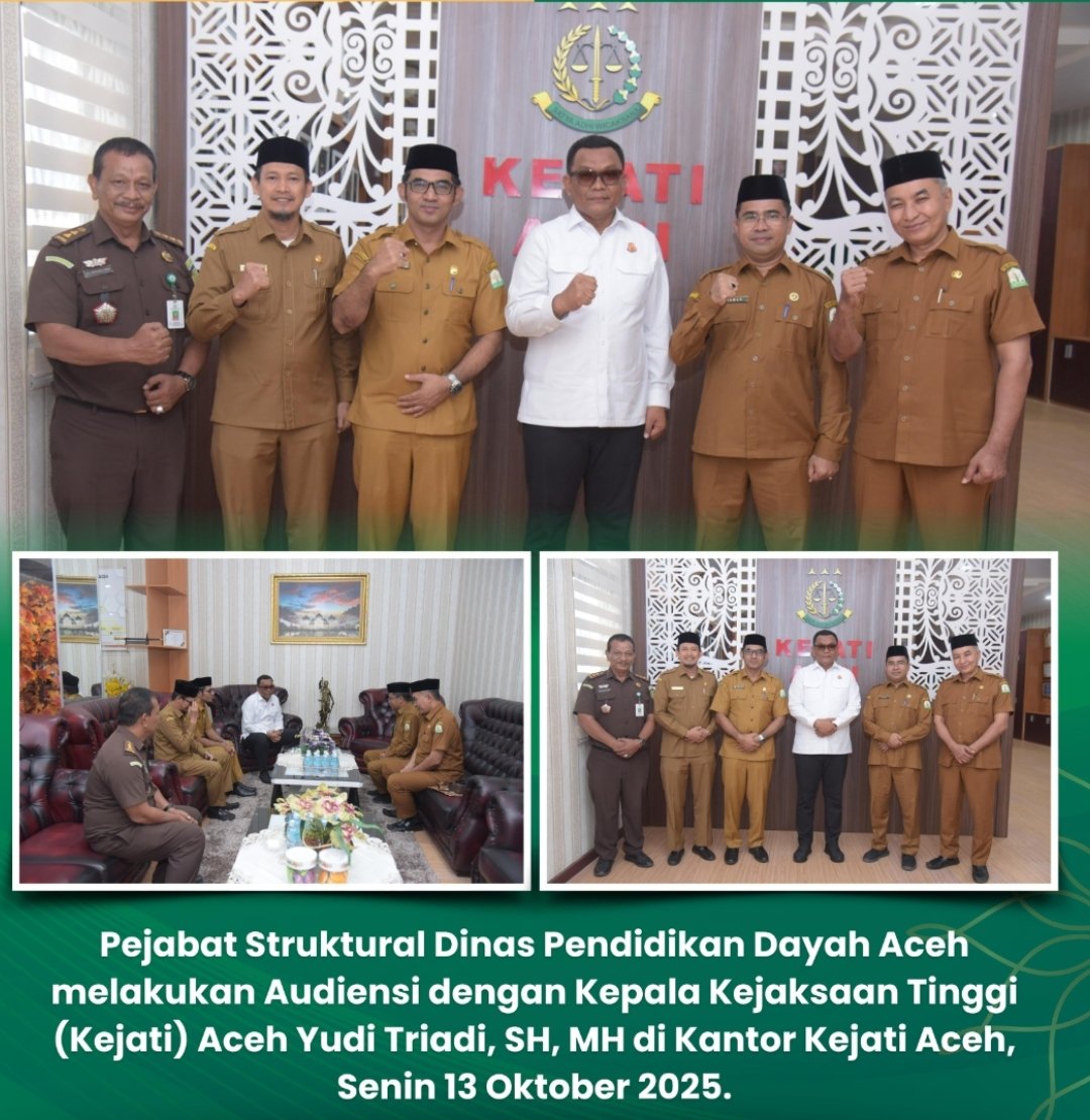 Banda Aceh – Dalam upaya memperkuat sinergi antara dunia pendidikan dayah dengan lembaga penegak hukum, pejabat struktural Dinas Pendidikan Dayah Aceh melakukan audiensi dengan Kepala Kejaksaan Tinggi (Kajati) Aceh, Yudi Triadi, SH, MH, di Kantor Kejati Aceh, Senin (13/10/2025).