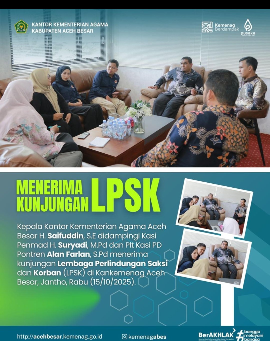 Aceh Besar – Dalam upaya memperkuat sinergi antarinstansi dalam bidang perlindungan hukum dan kemanusiaan, Kantor Kementerian Agama (Kankemenag) Kabupaten Aceh Besar menerima kunjungan resmi dari Lembaga Perlindungan Saksi dan Korban (LPSK) pada Rabu (15/10/2025).