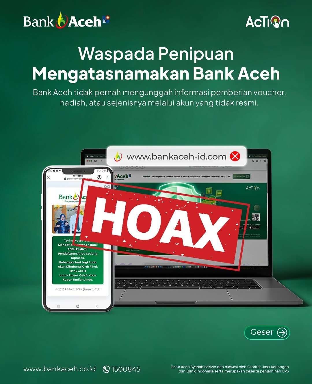 ACEH – Bank Aceh mengeluarkan imbauan resmi kepada seluruh nasabah agar selalu waspada terhadap upaya penipuan yang mengatasnamakan Bank Aceh. Dalam keterangan resminya, Bank Aceh menegaskan bahwa pihaknya tidak pernah mengunggah informasi pemberian hadiah, voucher, atau promo sejenis melalui akun atau situs yang tidak resmi.