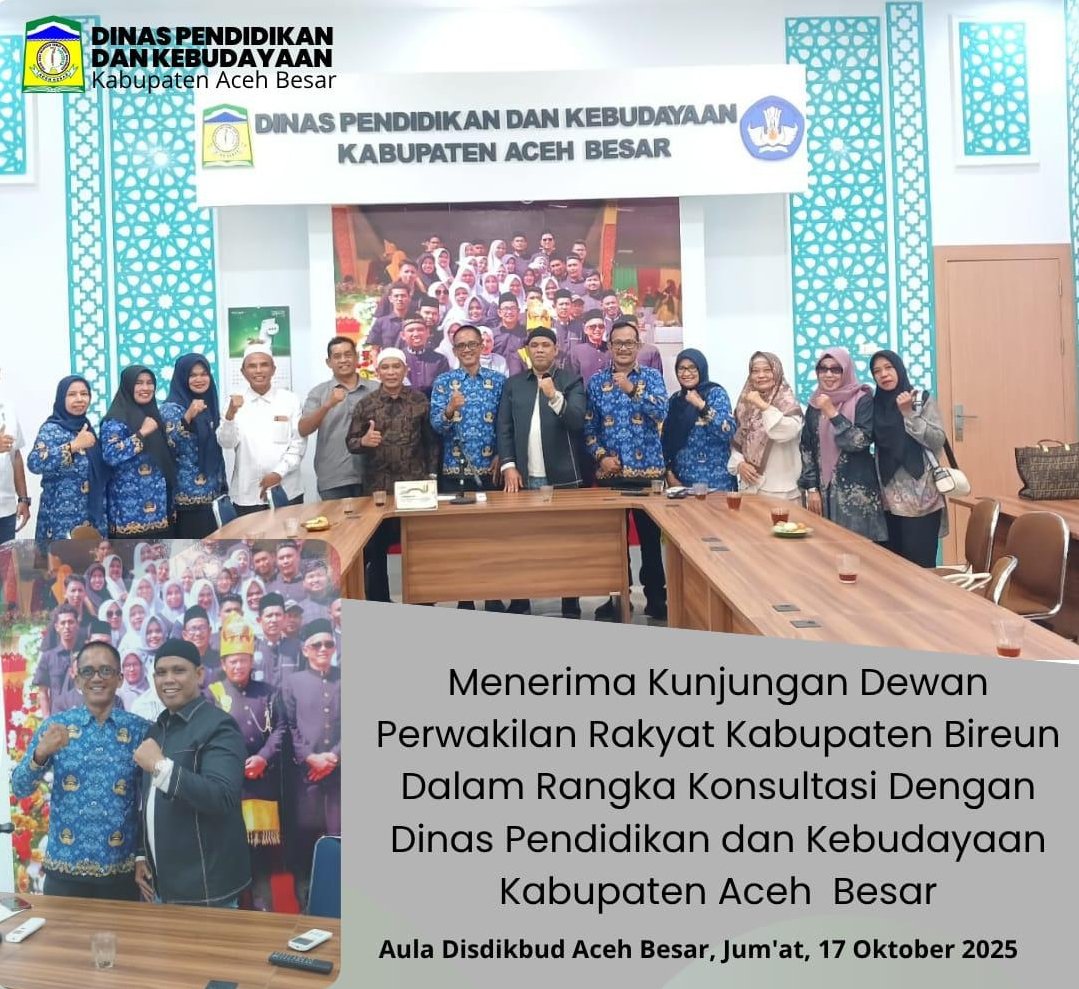 ACEH BESAR – Dinas Pendidikan dan Kebudayaan (Disdikbud) Kabupaten Aceh Besar menerima kunjungan kerja rombongan Dewan Perwakilan Rakyat Kabupaten (DPRK) Bireuen yang dipimpin langsung oleh Wakil Ketua DPRK Bireuen, Muslem Abdullah, pada Jumat (17/10/2025). Kunjungan tersebut berlangsung di Aula Disdikbud Aceh Besar dan disambut hangat oleh jajaran pimpinan serta pejabat struktural Disdikbud Aceh Besar.
