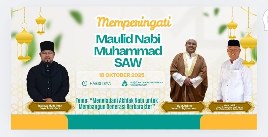Banda Aceh – Peringatan Maulid Nabi Muhammad SAW di Gampong Deah Baroe, Kecamatan Meuraxa, Kota Banda Aceh, pada Minggu, 18 Oktober 2025, berlangsung meriah dan penuh kekhidmatan. Sejak pagi hari hingga malam, suasana gampong dipenuhi semangat kebersamaan dan lantunan shalawat yang menggema dari Masjid Gampong Deah Baroe.