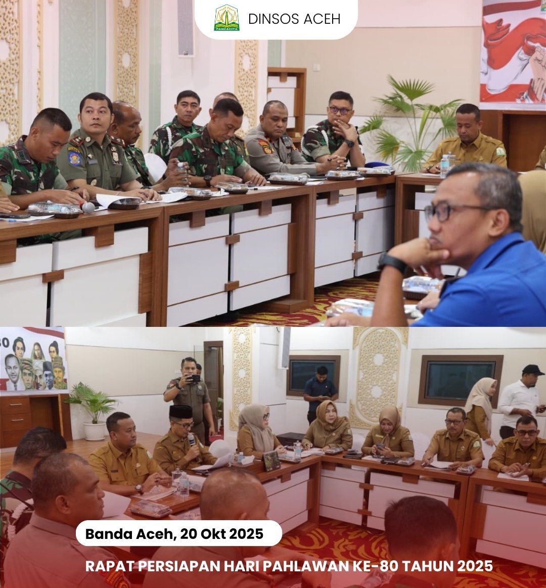 Banda Aceh – Dalam rangka menyambut peringatan Hari Pahlawan ke-80 Tahun 2025, Pemerintah Aceh melalui Dinas Sosial Aceh menggelar rapat persiapan yang berlangsung di Ruang Rapat Potda Lantai 3 Setda Aceh, Senin (20/10/2025).