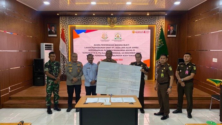 Kajari menjelaskan, berdasarkan putusan Mahkamah Agung RI, lahan perkebunan kelapa sawit seluas 429 hektare di Desa Perkebunan Alur Jambu, Kecamatan Bandar Pusaka, yang sebelumnya dikuasai PT Desa Jaya Alur Jambu sejak tahun 1988 dan telah habis masa HGU-nya, dikembalikan kepada negara melalui Pemerintah Kabupaten Aceh Tamiang.