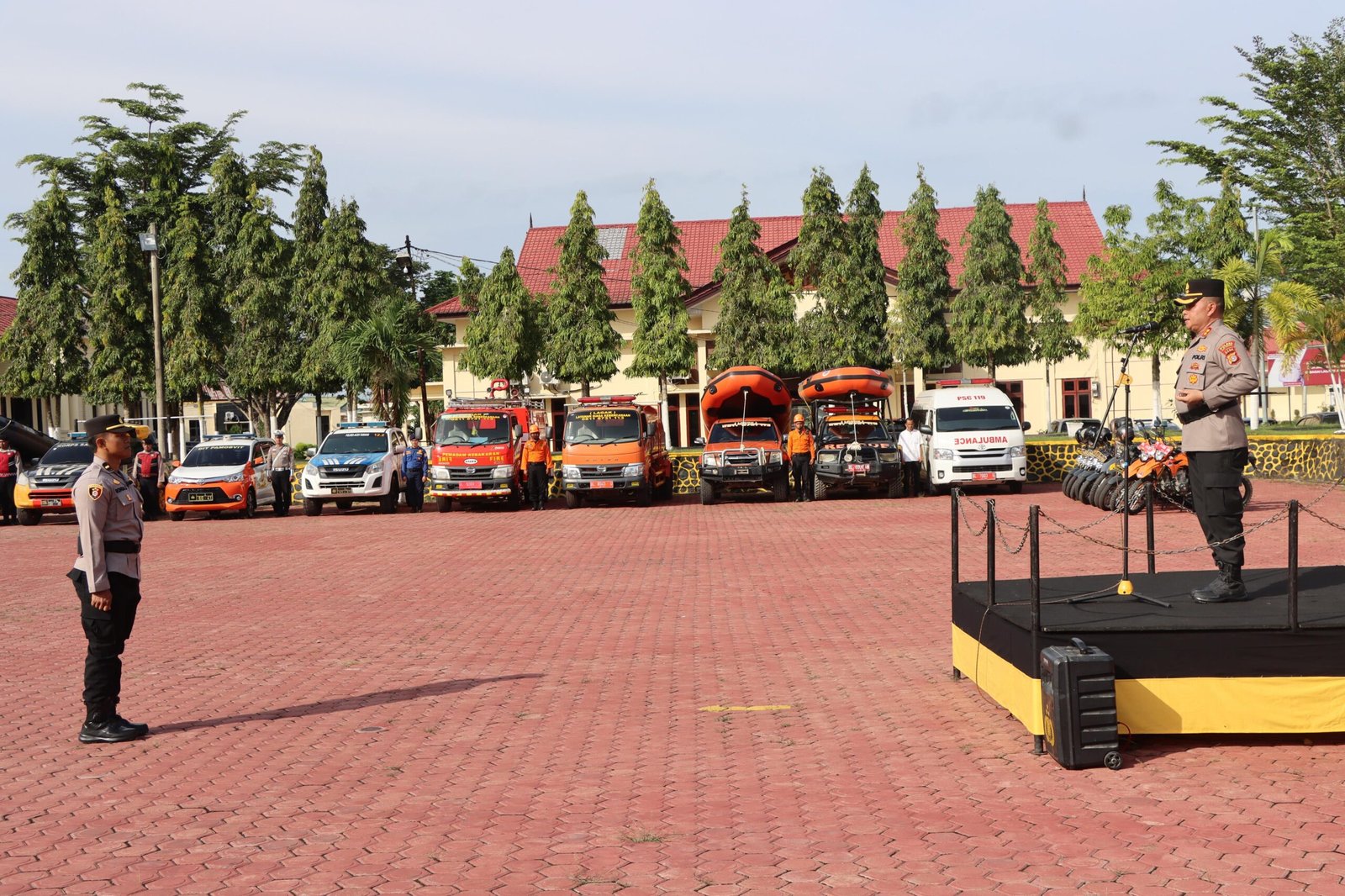 Usai pelaksanaan apel, kegiatan dilanjutkan dengan pemeriksaan pasukan dan perlengkapan tanggap darurat bencana. Sejumlah alat dan sarana pendukung yang ditampilkan antara lain mobil patroli Polri, Mobil AWC Polri, kendaraan operasional BPBD, mobil pemadam kebakaran, ambulans Dinas Kesehatan, mobil Dokkes Polri, Kendaraan patroli roda 2 Polri, perahu karet, mesin alkon, tenda darurat, gergaji mesin (chainsaw), sekop, cangkul, pelampung keselamatan, serta perlengkapan komunikasi lapangan seperti handy talky (HT) dan megaphone.