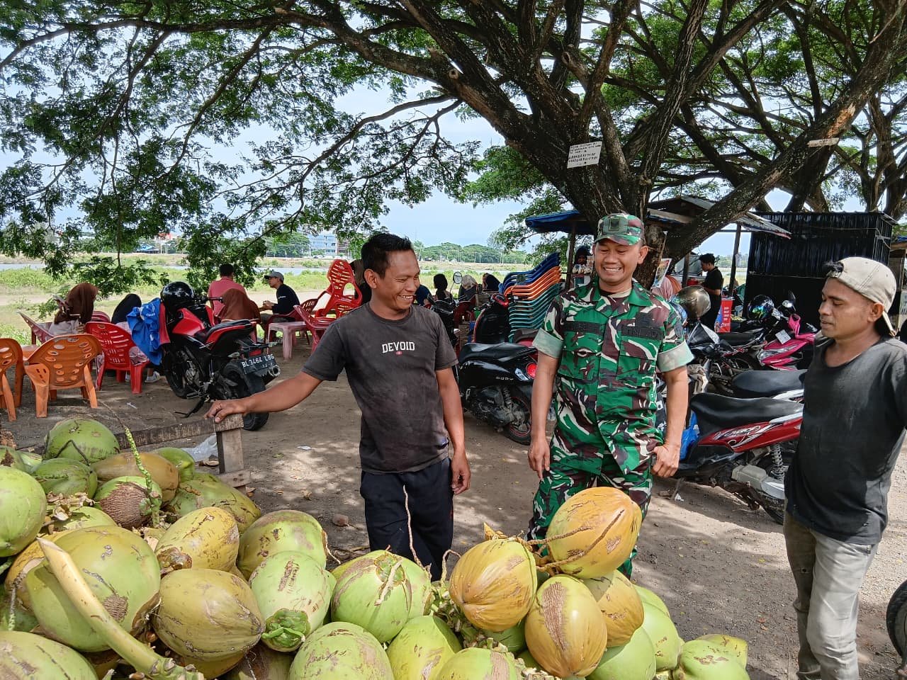 Syiah Kuala, Banda Aceh – Sebagai wujud kepedulian terhadap kebersihan dan kenyamanan lingkungan, Babinsa Koramil 25/Syiah Kuala Kodim 0101/Kota Banda Aceh, Sertu Ahmad Chaitami, melaksanakan kegiatan Komunikasi Sosial (Komsos) bersama warga yang berprofesi sebagai pedagang es kelapa muda di wilayah Kecamatan Syiah Kuala, Sabtu (8/11/2025).