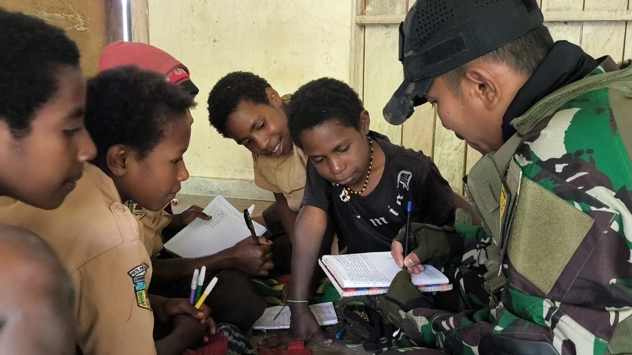 Kegiatan yang penuh kehangatan ini bertujuan untuk menumbuhkan semangat belajar dan menanamkan nilai-nilai kebangsaan kepada generasi anak-anak Papua Para prajurit tidak hanya mengajarkan pelajaran dasar seperti membaca, menulis, dan berhitung, tetapi juga memberikan motivasi tentang pentingnya pendidikan untuk meraih masa depan yang lebih baik.