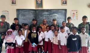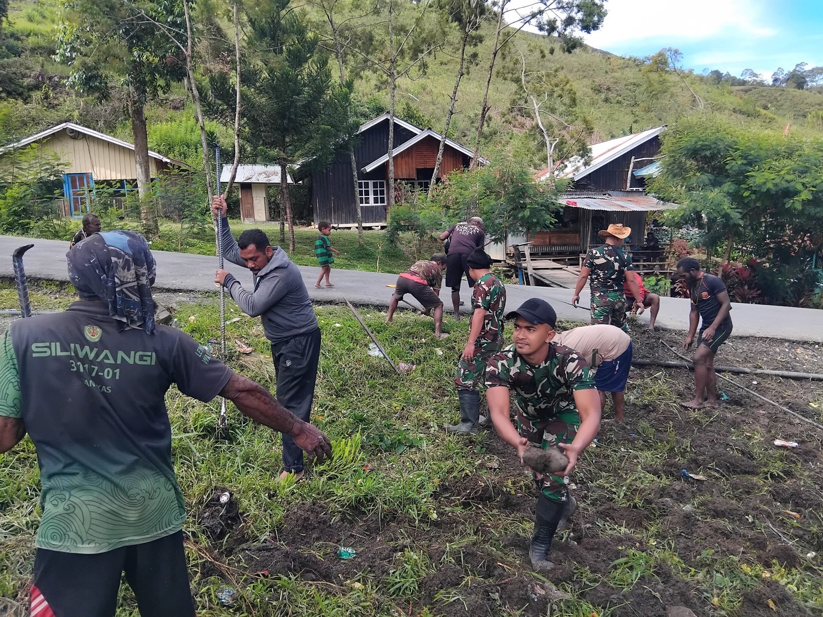 Papua Tengah – Pos Tinggi Nambut Satgas Yonif 112/DJ bersama rakyat melaksanakan kegiatan Karya Bakti Teritorial dengan bergotong royong bersihkan lingkungan di Distrik Tinggi Nambut Kabupaten Puncak Jaya Provinsi Papua Tengah, Senin (10/11/2025).