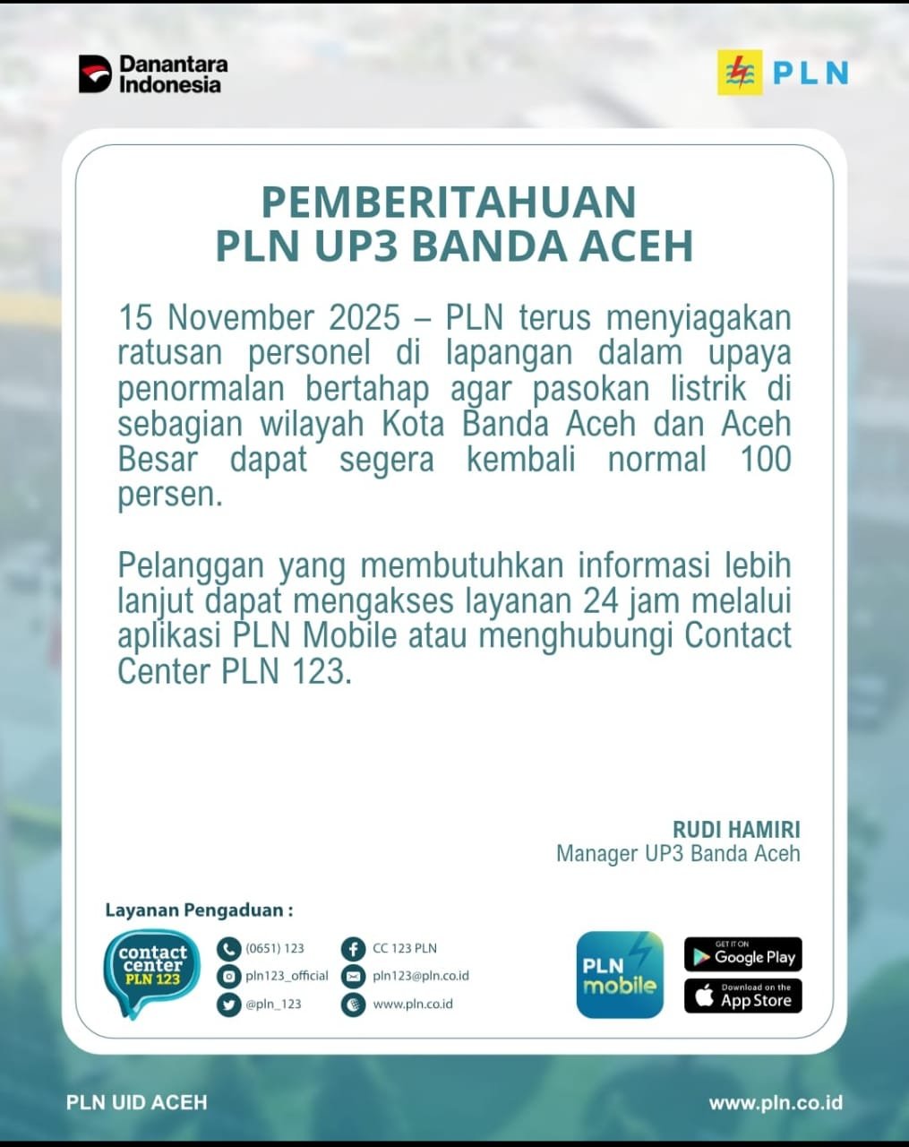 “Seluruh personel kami bekerja maksimal di lapangan. Targetnya, suplai listrik di Banda Aceh dan Aceh Besar bisa kembali normal secara menyeluruh,” ujar Rudi dalam keterangannya.