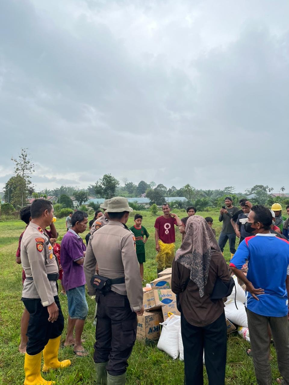 Aceh Tamiang — Personel Ditsamapta Polda Aceh yang diperbantukan (BKO) ke Kabupaten Aceh Tamiang melaksanakan tugas pengamanan sekaligus mengumpulkan bantuan sembako yang diturunkan dari Helikopter Polri dan TNI AU.