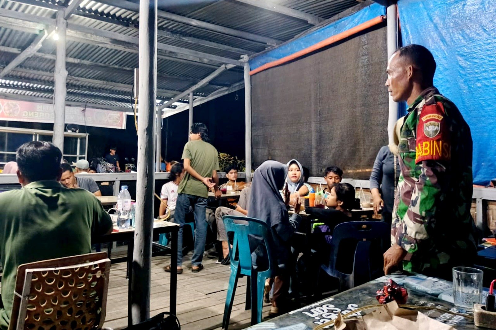 Tampak terlihat Serda Fajri, salah satu Bintara Pembina Desa (Babinsa) Koramil 19/Leupung, yang sedang melaksanakan patroli keamanan lingkungan pada malam hari ini difokuskan di wilayah Kecamatan Leupung, Kabupaten Aceh Besar. Berbeda dengan patroli konvensional, Serda Fajri melaksanakan pendekatan humanis dengan secara langsung menyambangi pusat-pusat keramaian dan tempat berkumpulnya warga.