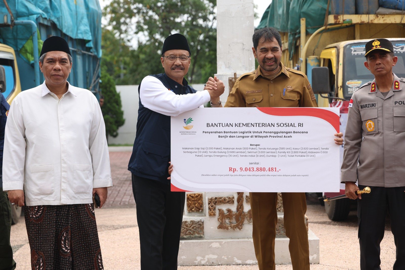Bantuan logistik yang diterima Pemerintah Aceh tersebut diangkut menggunakan 24 unit truk dan diperuntukkan bagi penanganan bencana banjir dan longsor yang melanda sejumlah kabupaten/kota di Aceh. Bantuan itu terdiri atas makanan siap saji, tenda keluarga, kasur, tenda serba guna, tenda gulung, selimut, perlengkapan keluarga dan anak, pakaian anak, lampu darurat, tenda induk, hingga toilet portabel.