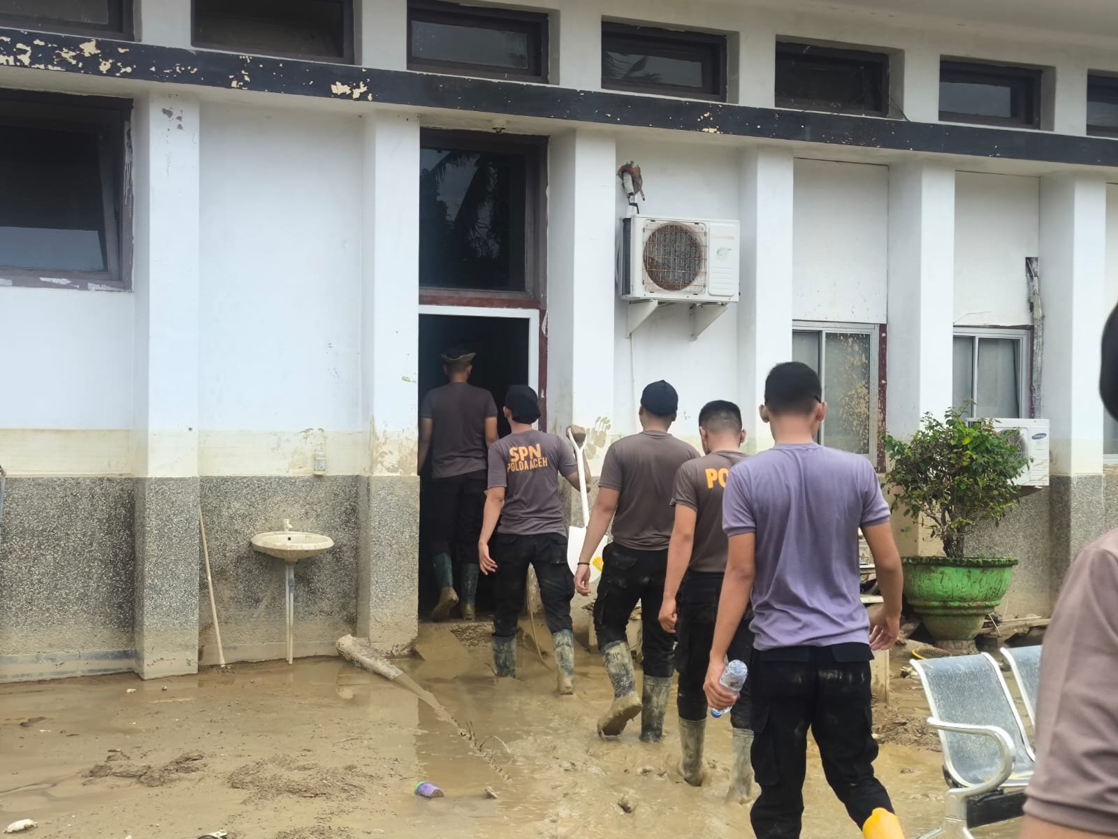 Aceh Tamiang — Personel Satbrimob Polda Aceh melaksanakan kegiatan pembersihan (korve) di Rumah Sakit Pertamina Rantau, Kabupaten Aceh Tamiang, pada Rabu, 17 Desember 2025, pascabanjir yang melanda wilayah tersebut.
