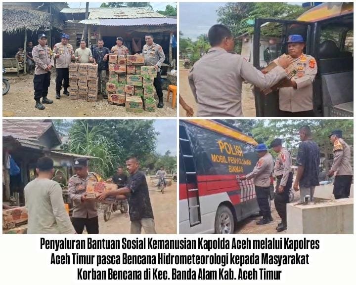 Aceh Timur — Kapolda Aceh Irjen Pol. Drs. Marzuki Alibasyah, M.M., menyalurkan bantuan sosial kepada masyarakat yang terdampak bencana alam di Kecamatan Banda Alam, Kabupaten Aceh Timur, pada Rabu, 17 Desember 2025.