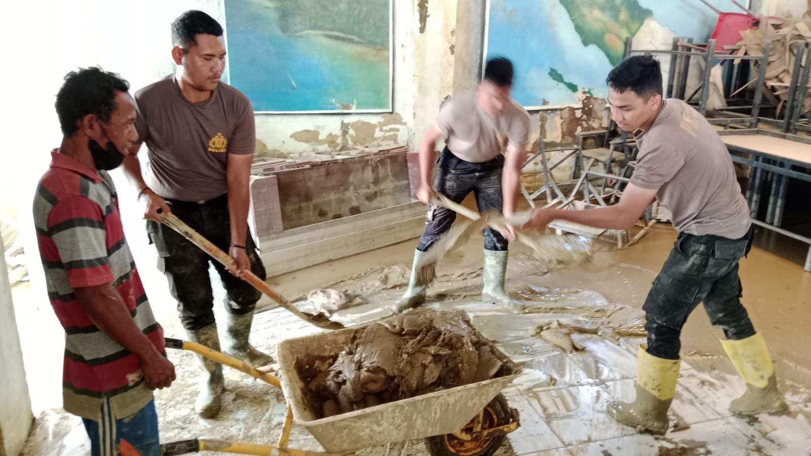 Personel Polda Aceh Bersihkan Fasilitas Kesehatan dan Rumah Warga Terdampak Banjir di Aceh Tamiang