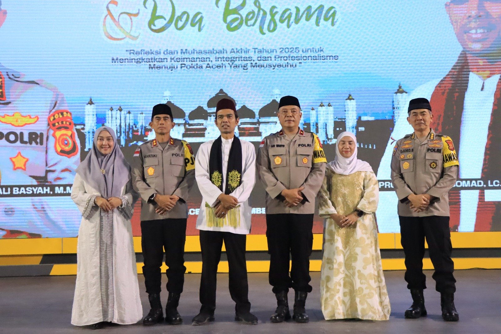 Banda Aceh — Ustaz Abdul Somad (UAS) menyampaikan tausiah bertema trauma healing melalui pendekatan religi kepada personel Polda Aceh dan Pengurus Bhayangkari Daerah Aceh. Kegiatan tersebut berlangsung di Meuligoe Polda Aceh, Kamis malam, 25 Desember 2025, usai Salat Isya, dan dirangkai dengan doa bersama.