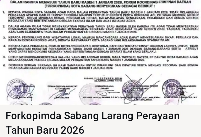 “Seruan bersama ini disampaikan untuk dimaklumi dan dipatuhi serta menjadi pedoman bagi semua pihak dalam menyikapi Tahun Baru Masehi 1 Januari 2026,” demikian penegasan Forkopimda Sabang dalam surat imbauannya.