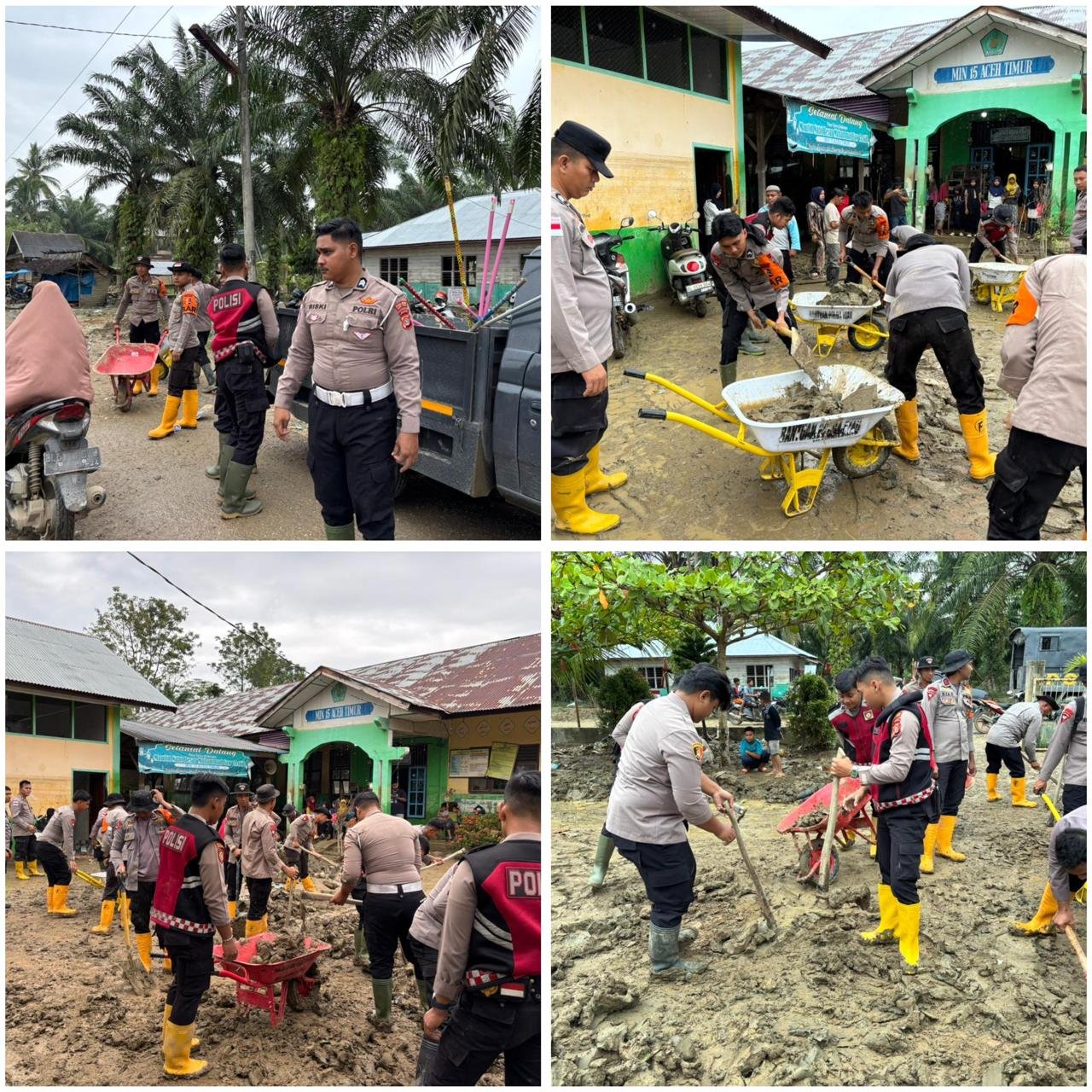 Aceh Timur — Polres Aceh Timur bersama BKO Resimen 1 Pelopor Kedung Halang melaksanakan aksi kemanusiaan berupa pembersihan dan gotong royong pascabencana banjir di MIN 15 Aceh Timur, Kecamatan Pante Bidari, Kabupaten Aceh Timur, Selasa, 6 Januari 2026.