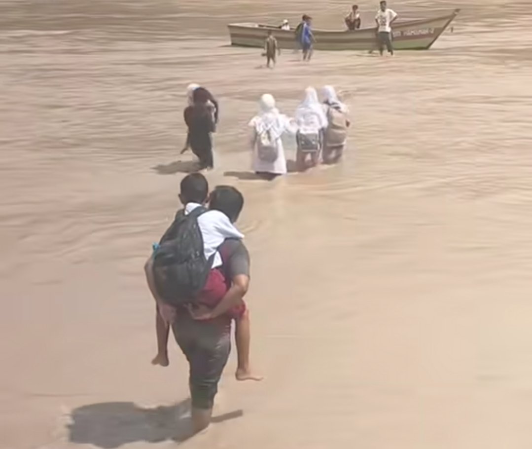 Sejak pagi hari, puluhan siswa terlihat berbondong-bondong menuju sekolah dengan penuh kehati-hatian. Mereka harus menyeberangi sungai yang membelah desa sebagai satu-satunya akses menuju sekolah. Dalam kondisi tersebut, peran orang tua sangat terasa. Mereka dengan sabar mendampingi anak-anaknya, memastikan keselamatan selama menyeberang sungai demi menuntut ilmu.