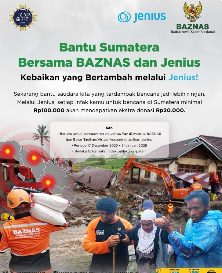 JAKARTA – Bencana alam yang melanda sejumlah wilayah di Sumatera masih meninggalkan duka dan luka mendalam bagi masyarakat terdampak. Di tengah upaya pemulihan yang terus berjalan, bantuan dan kepedulian dari berbagai pihak sangat dibutuhkan untuk meringankan beban para korban. Menjawab kebutuhan tersebut, Badan Amil Zakat Nasional (BAZNAS) menjalin kolaborasi dengan Jenius untuk mengajak masyarakat berpartisipasi dalam gerakan kemanusiaan melalui program infak.