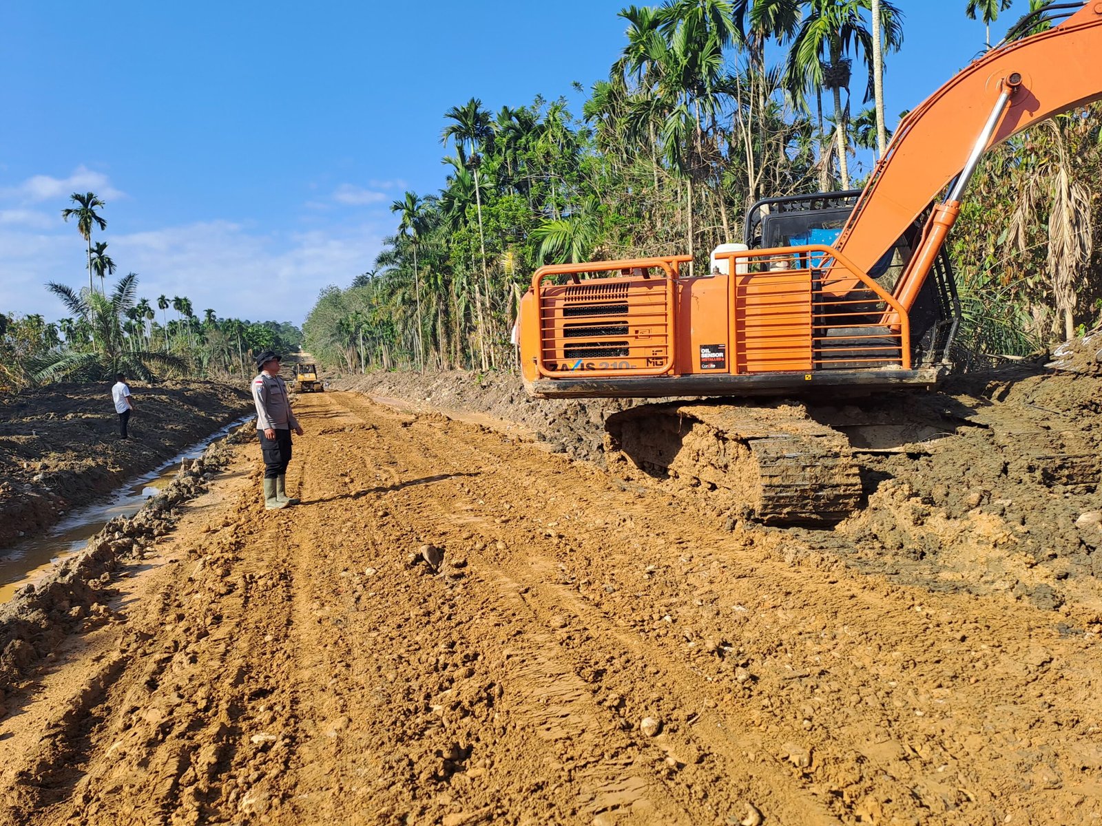 Beko Bantuan Polri Dikerahkan untuk Pembuatan Parit di Jalan Len Pipa Aceh Utara