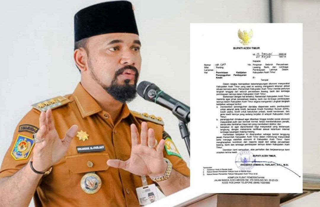Permintaan tersebut disampaikan langsung oleh Bupati Aceh Timur, Iskandar Usman Al Farlaky, melalui surat resmi bernomor 581/237 tertanggal 14 Januari 2026. Surat yang bersifat penting itu ditujukan kepada pimpinan bank, lembaga keuangan, serta perusahaan pembiayaan di Kabupaten Aceh Timur sebagai bentuk kepedulian pemerintah daerah terhadap kondisi sosial dan ekonomi masyarakat pascabencana.