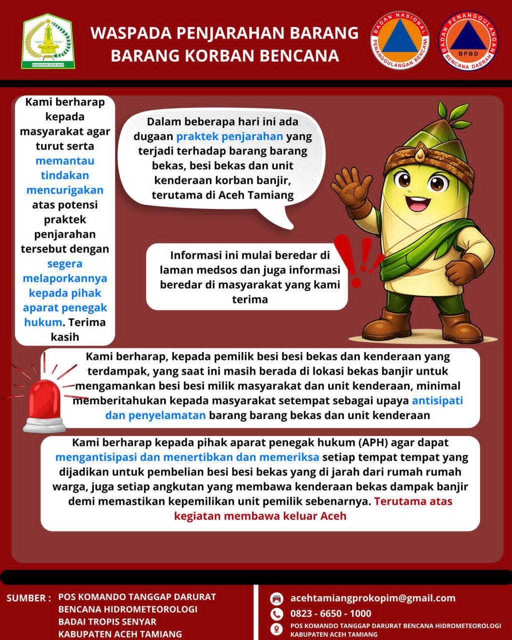 Pemerintah Kabupaten Aceh Tamiang mengeluarkan seruan kewaspadaan penjarahan pasca bencana hidrometeorologi di Aceh Tamiang. Seruan ini dikuatkan terkait adanya dugaan praktik penjarahan barang-barang bekas milik korban bencana yang mulai beredar di laman medsos dan juga beredar di masyarakat.Minggu, 18 Jabuari 2026