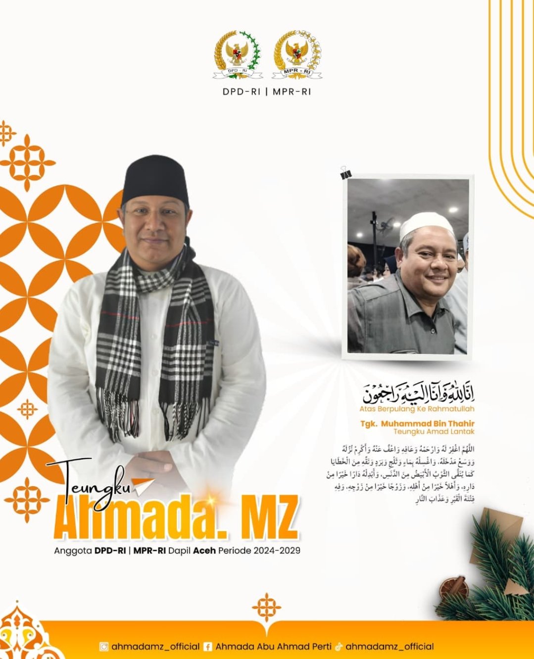 Banda Aceh — Kabar duka menyelimuti keluarga besar Tgk Ahmada, Anggota DPD RI/MPR RI Daerah Pemilihan Aceh periode 2024–2029. Salah satu tokoh yang sangat dihormati dalam lingkungan keluarga dan masyarakat, Tgk. Muhammad Bin Thahir, yang dikenal dengan sebutan Teungku Amad Lantak, telah berpulang ke Rahmatullah.