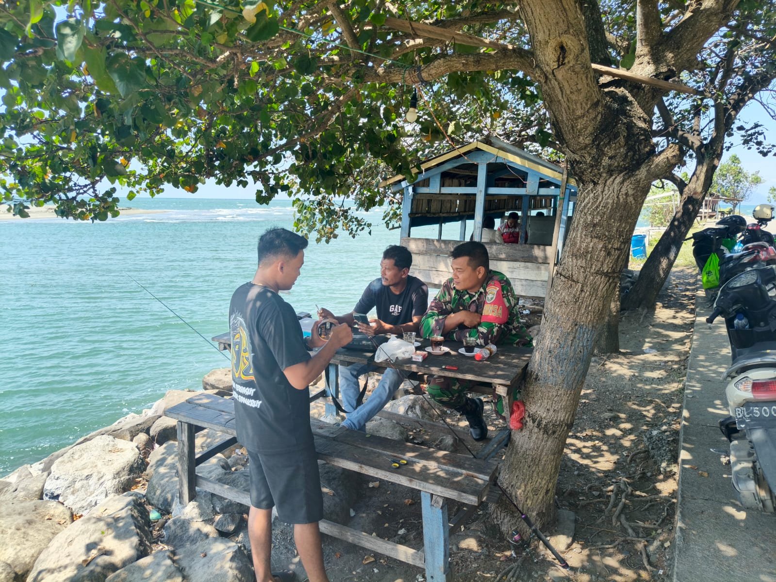 Aceh Besar — Dalam upaya mempererat hubungan kedekatan dengan masyarakat binaan, Babinsa Koramil 25/Suka Makmur Kodim 0101/Kota Banda Aceh, Serda Faisal, melaksanakan kegiatan komunikasi sosial (Komsos) bersama masyarakat pengunjung yang sedang memancing ikan di perairan Pantai Alue Naga, Krueng Raya, Kabupaten Aceh Besar, Kamis (29/1/2026).