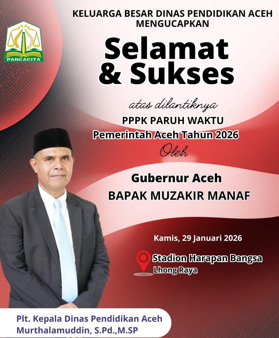 Nanda Aceh – Plt. Kepala Dinas Pendidikan Aceh, Murthalamuddin, S.Pd,.M.SP, menyampaikan ucapan selamat dan sukses kepada seluruh Pegawai Pemerintah dengan Perjanjian Kerja (PPPK) Paruh Waktu Tahun 2026 yang telah resmi dilantik oleh Gubernur Aceh, Bapak Muzakir Manaf, di Stadion Harapan Bangsa, Lhong Raya, Banda Aceh, Kamis (29/1/2026).