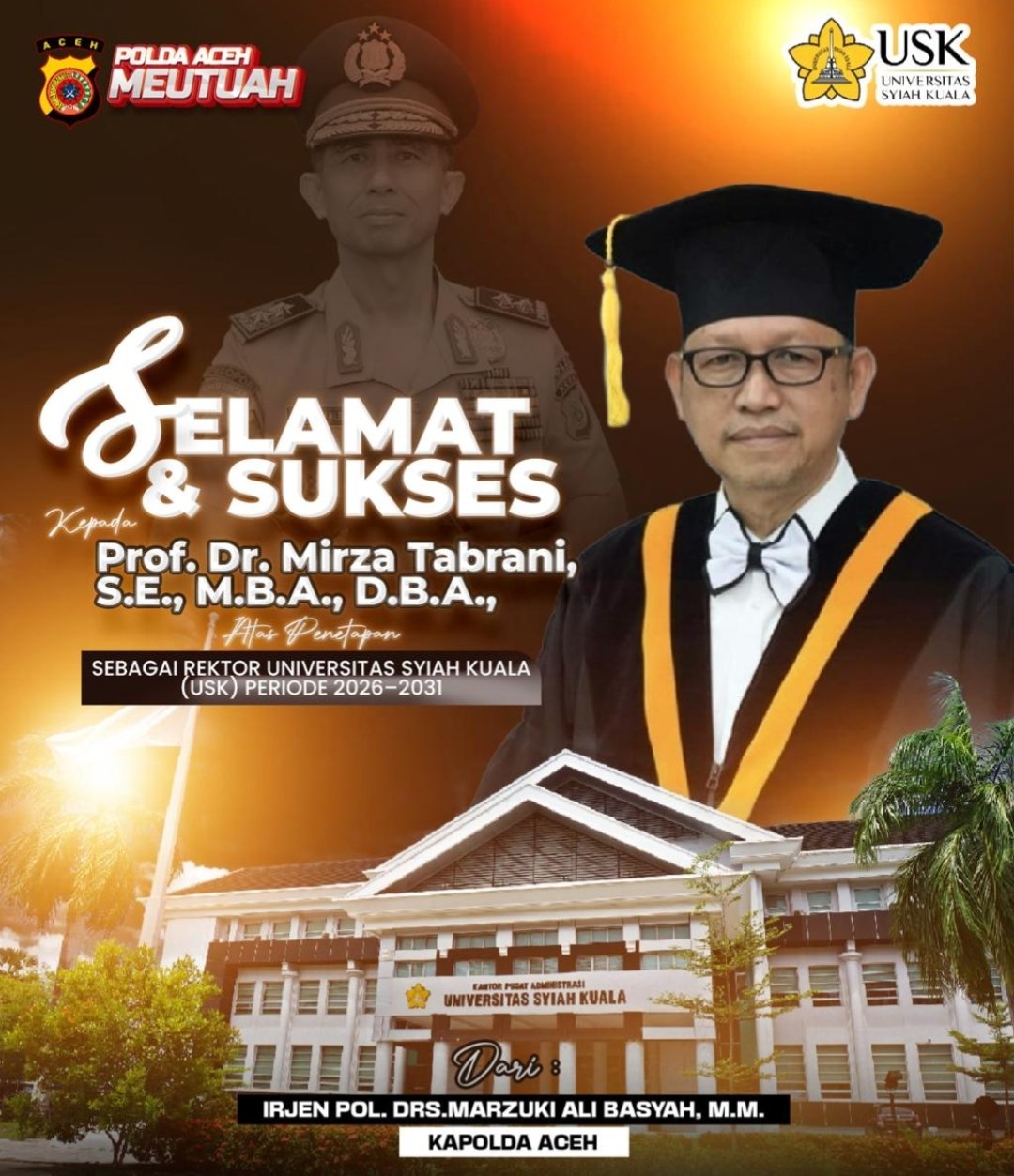 Banda Aceh – Kepala Kepolisian Daerah (Kapolda) Aceh, Irjen Pol. Drs. Marzuki Ali Basyah, M.M., menyampaikan ucapan selamat dan sukses kepada Prof. Dr. Mirza Tabrani, S.E., M.B.A., D.B.A. atas penetapannya sebagai Rektor Universitas Syiah Kuala (USK) periode 2026–2031, Senin, 2 Februari 2026.