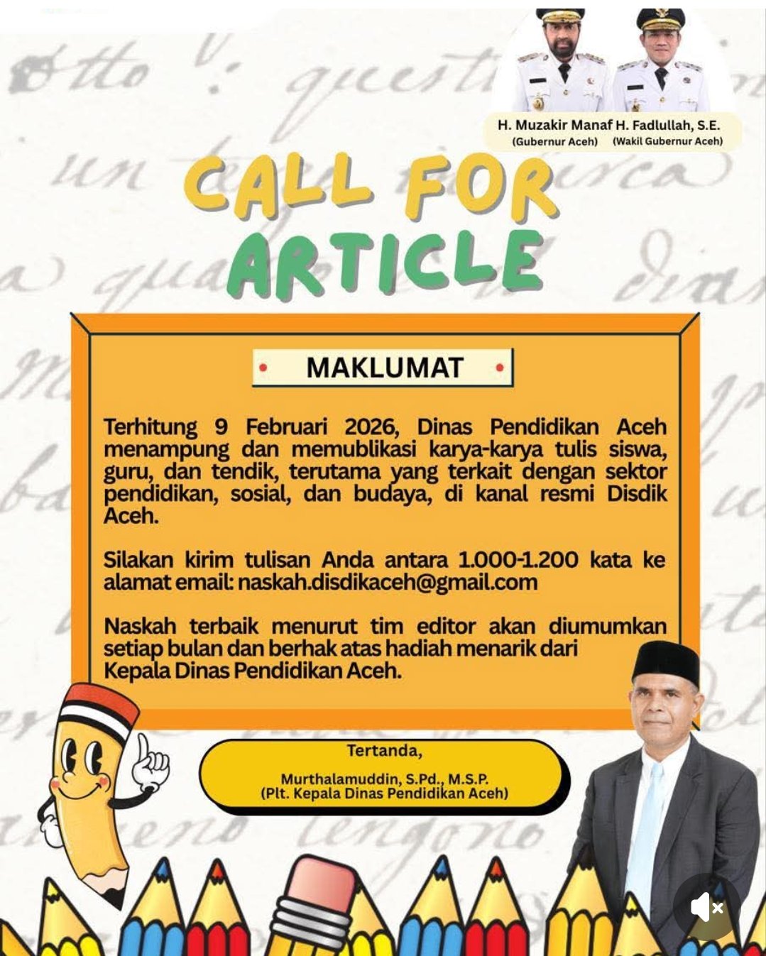 BANDA ACEH – Dinas Pendidikan Aceh kembali membuka ruang partisipasi publik melalui program Call for Article yang ditujukan bagi siswa, guru, dan tenaga kependidikan (tendik) di seluruh Aceh. Program ini menjadi wadah bagi insan pendidikan untuk menyalurkan ide, gagasan, serta kisah inspiratif seputar dunia pendidikan, sosial, dan budaya.