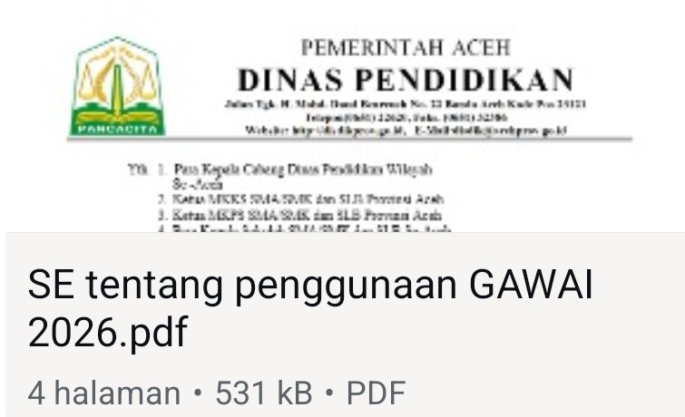 Surat edaran tersebut ditujukan kepada para Kepala Cabang Dinas Pendidikan Wilayah se-Aceh, Ketua MKKS dan MKPS SMA/SMK/SLB Provinsi Aceh, seluruh kepala sekolah, pendidik, serta tenaga kependidikan. Kebijakan ini mulai diberlakukan sebagai bentuk penguatan tata kelola pembelajaran dan pembinaan karakter peserta didik.(5/2/2026).