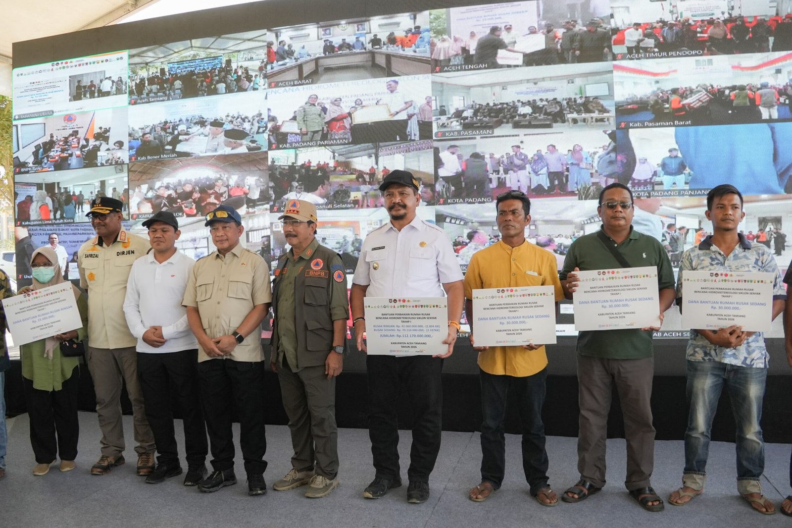 Hadir juga Bupati Aceh Tamiang, Armia Fahmi, bersama jajaran pemerintah daerah setempat yang mendukung pelaksanaan penyaluran bantuan perbaikan rumah bagi masyarakat terdampak bencana.