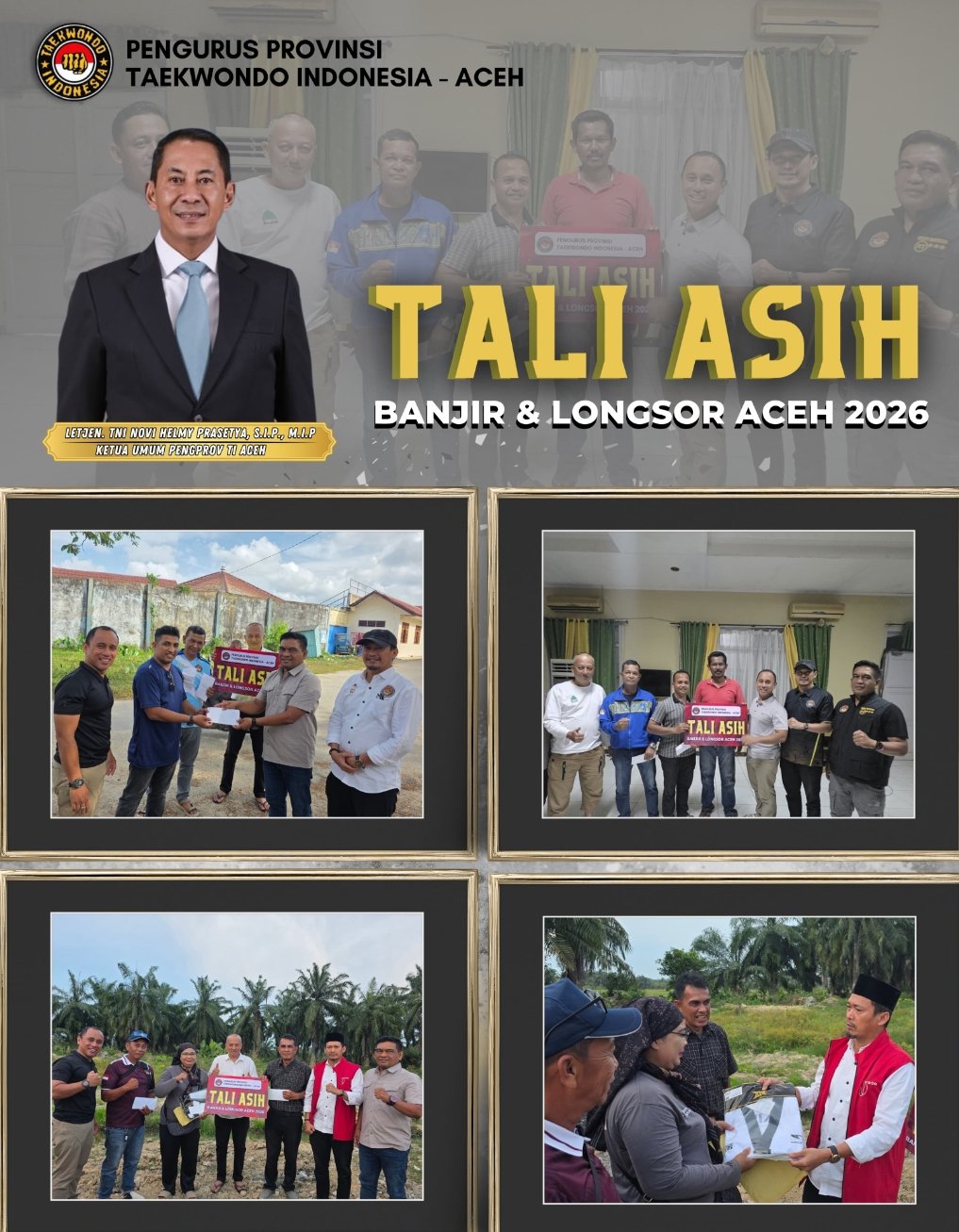 Ketua Umum Pengprov TI Aceh, Novy Helmi Prasetya, yang saat ini menjabat dengan pangkat Letjen TNI, melalui jajaran Wakil Ketua Umum yakni Samsul Bahri, Mahdan Al Mahirsyah, dan Andriansyah bersama para pengurus lainnya, melakukan kunjungan langsung ke empat kabupaten yang mengalami dampak terparah akibat bencana tersebut.