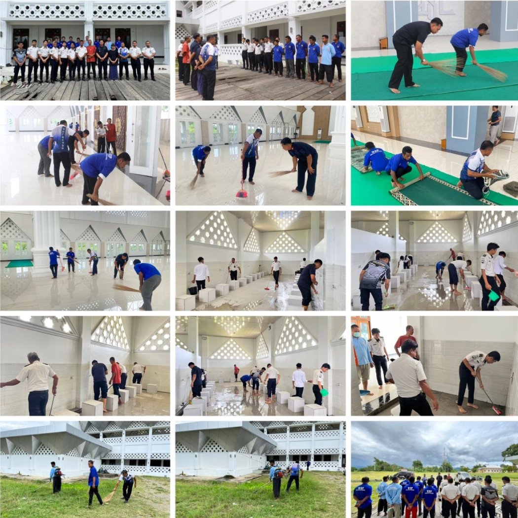 Sejak pukul 09.00 WIT, suasana masjid tampak lebih semarak dari biasanya. Para petugas dan WBP bahu-membahu membersihkan seluruh area masjid, baik di bagian dalam maupun luar bangunan. Lantai disapu dan dipel, karpet dibersihkan, tempat wudhu disikat hingga bersih, serta halaman masjid dirapikan dari sampah dan dedaunan kering.