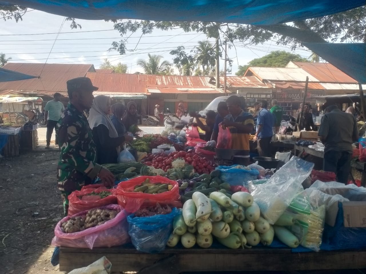 Dalam suasana pasar yang ramai namun tertib, Sertu Taisyir menyempatkan diri berdialog dengan pedagang untuk mengetahui kondisi pasokan dan daya beli masyarakat. Pendekatan komunikatif ini tidak hanya memberikan data lapangan yang akurat, tetapi juga mempererat hubungan antara aparat dan warga.